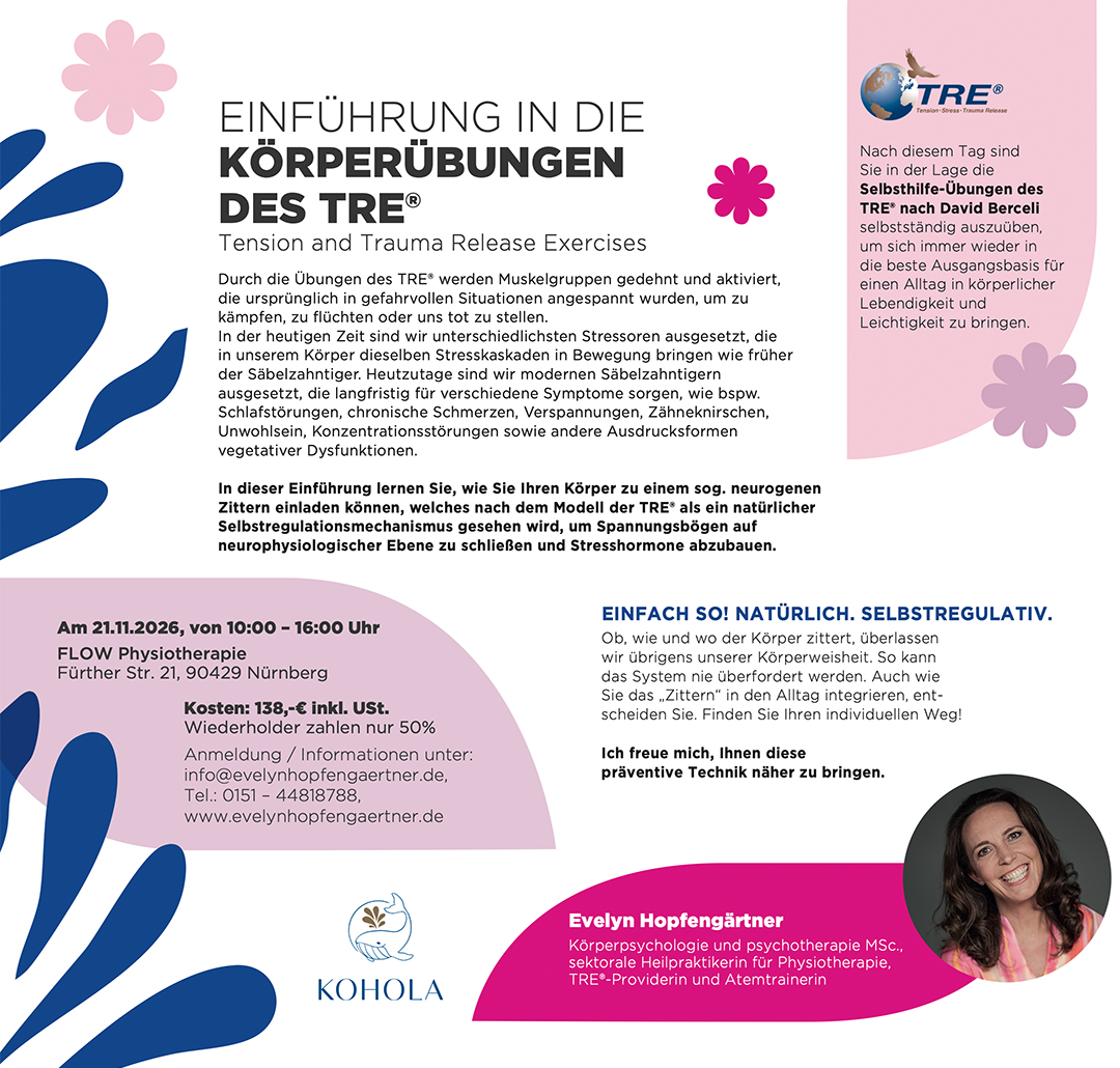 Diese einfach zu erlernenden Körperübungen nach Dr. David Berceli laden den Körper zu unwillkürlichen Körperbewegungen und Zittern ein. Dies stellt eine Lösungsmöglichkeit für Stress und Anspannung dar und erleichtert es dem Körper sich auf körperlicher und seelischer Ebene selbst zu regulieren und so Wohlbefinden und Lebendigkeit zu bewahren.